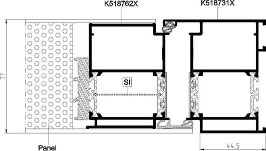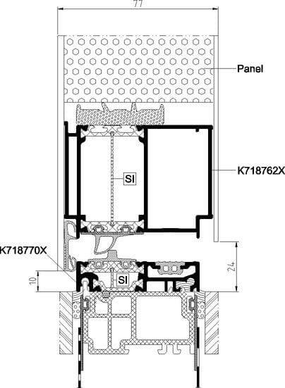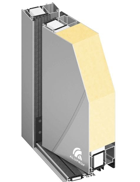 Glazed model. From the inside, the aluminium panel pattern is made identically to the outside. Possibility of using a stainless steel kick: glued or flush. Used in three types of fillings: batch, one-sided and double-sided overlay.